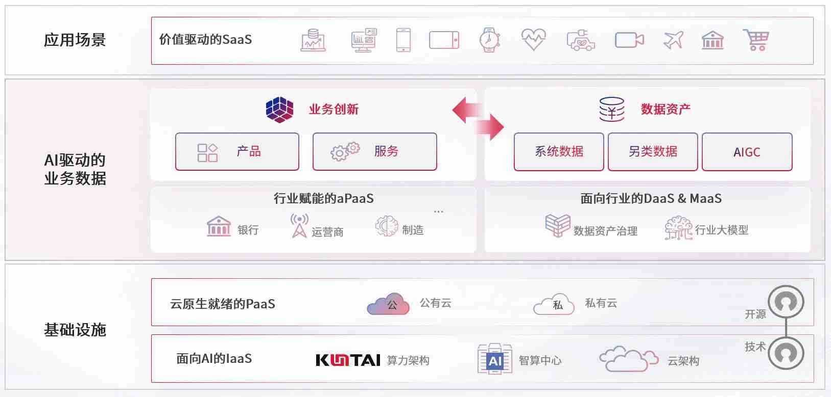 数字时代,,,,围绕企业数字化转型的关键要素,,,AG尊龙凯时数码开创性的提出数云融合战略和技术体系框架,,着力在云原生、、、数字原生、、、AI原生和信创产业上架构产品和服务能力,,,为处在不同数字化转型阶段的快消零售、、、汽车、、、金融、、、医疗、、、、政企、、、、教育、、运营商等行业客户提供泛在的敏捷IT能力和融合的数据驱动能力,,,构建跨界融合创新的数字业务场景和新业务模式,,,,助力企业级客户建立面向未来的核心能力和竞争优势,,,全面推动社会的数字化、、、、智能化转型升级。。。。