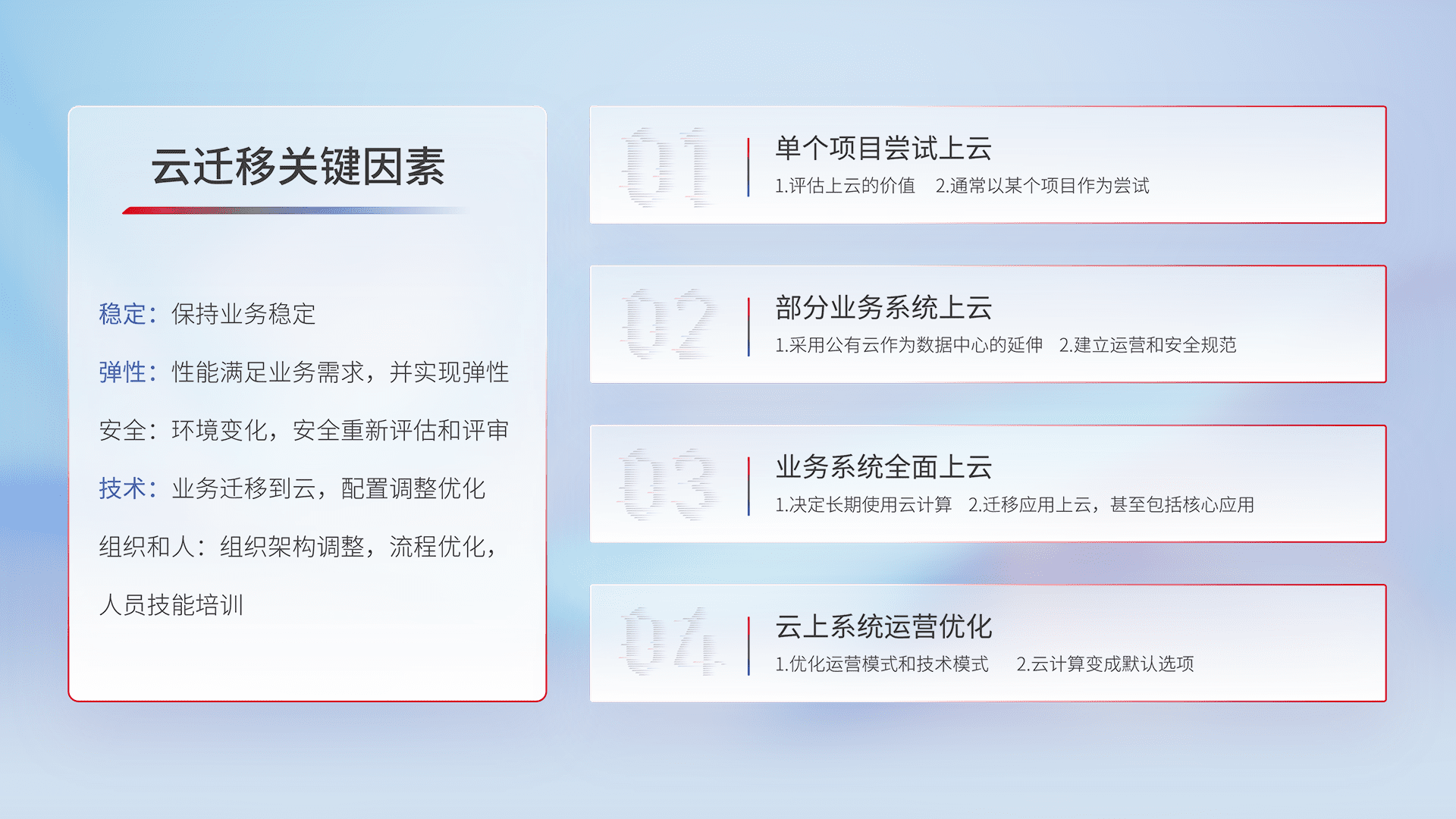 结合实际业务,,,从规划设计、、、云平台选型、、云原生改造、、数据迁移、、、、集成交付,,,,迁移全过程为客户识别最佳上云路径,,,做好风险识别管理,,,,设计网络架构、、、、身份权限、、、、安全审计合规、、、、操作审计、、日志审计、、、监控告警策略、、多站点容灾设计等,,,,对云上基础设施进行整体规划,,,提升IT治理水平,,,以满足弹性、、高可用、、、高性能的需求。。。。