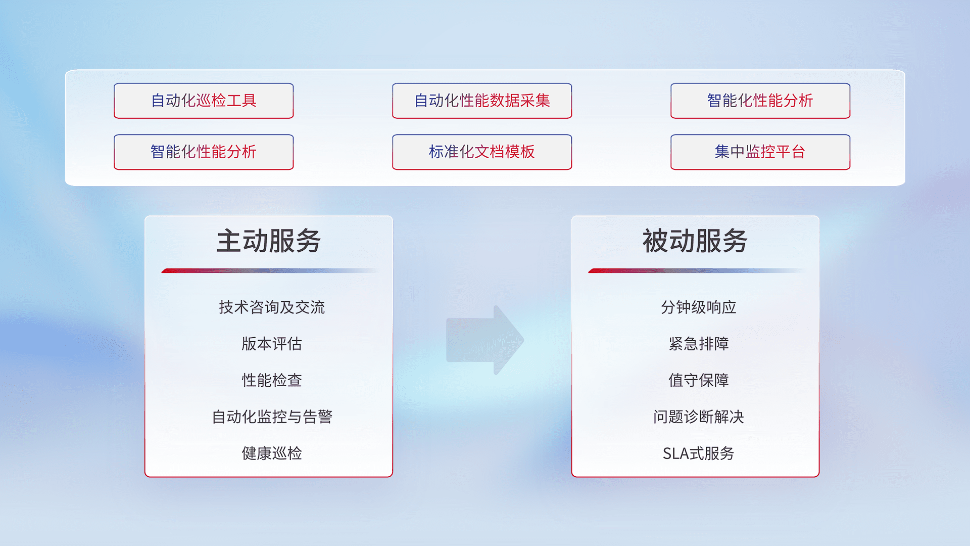 智能化工具和标准化文档,,,,保障服务质量,,,,提供主动服务(包含技术咨询、、、、版本评估、、、性能检查、、、、自动化监控与告警、、、健康巡检)和被动服务包含(分钟级响应、、、紧急排障、、值守保障、、、问题诊断解决、、、SLA服务)。。